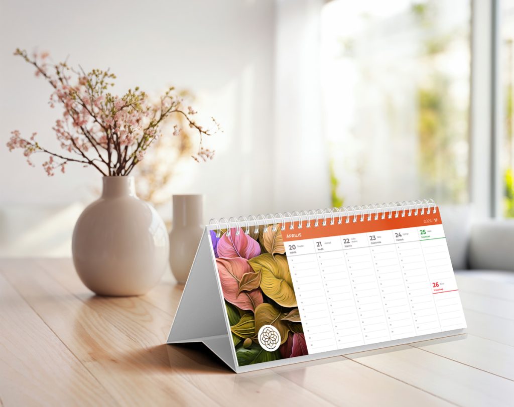 285×135 mm méretű, heti beosztású spirálozott asztali naptár.